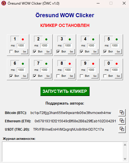 Программа была вам полезна? Вы можете поддержать разработчика через крипто-кошельки (доступны в интерфейсе программы). Автокликер для WoW распространяется и всегда будет распространяться бесплатно, вы также можете помочь нам рекомендуя его своим друзьям.